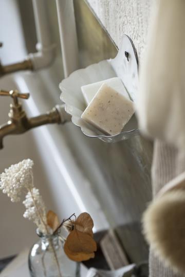 Dekorativ vægmonteret sæbeskål i emalje, ideel til badeværelse eller køkken i klassisk stil. Denne emaljerede sæbeskål kombinerer funktionalitet og elegant design og giver et tidløst udtryk med både praktisk anvendelse og æstetisk finesse.