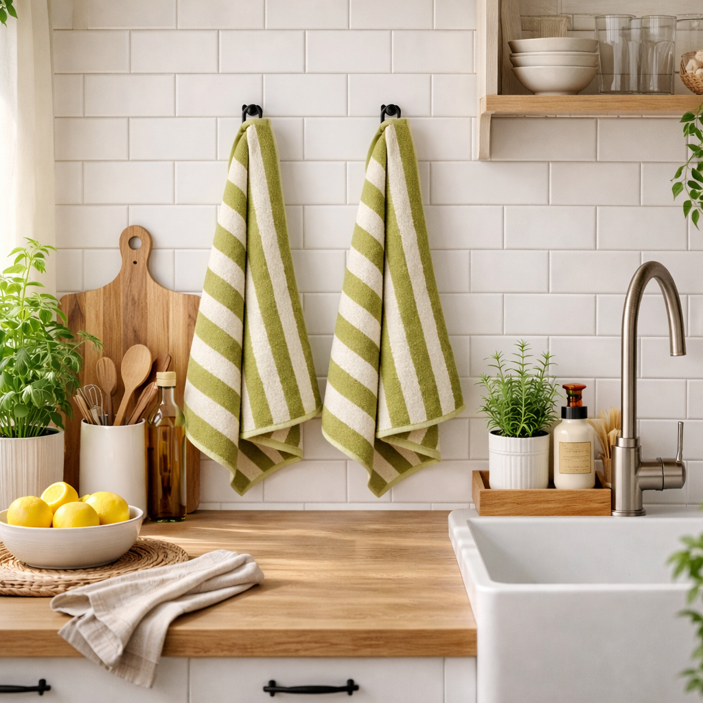 Forvandl dit køkken eller badeværelse med vores elegante køkken- og gæstehåndklæder i 100% bomuld.