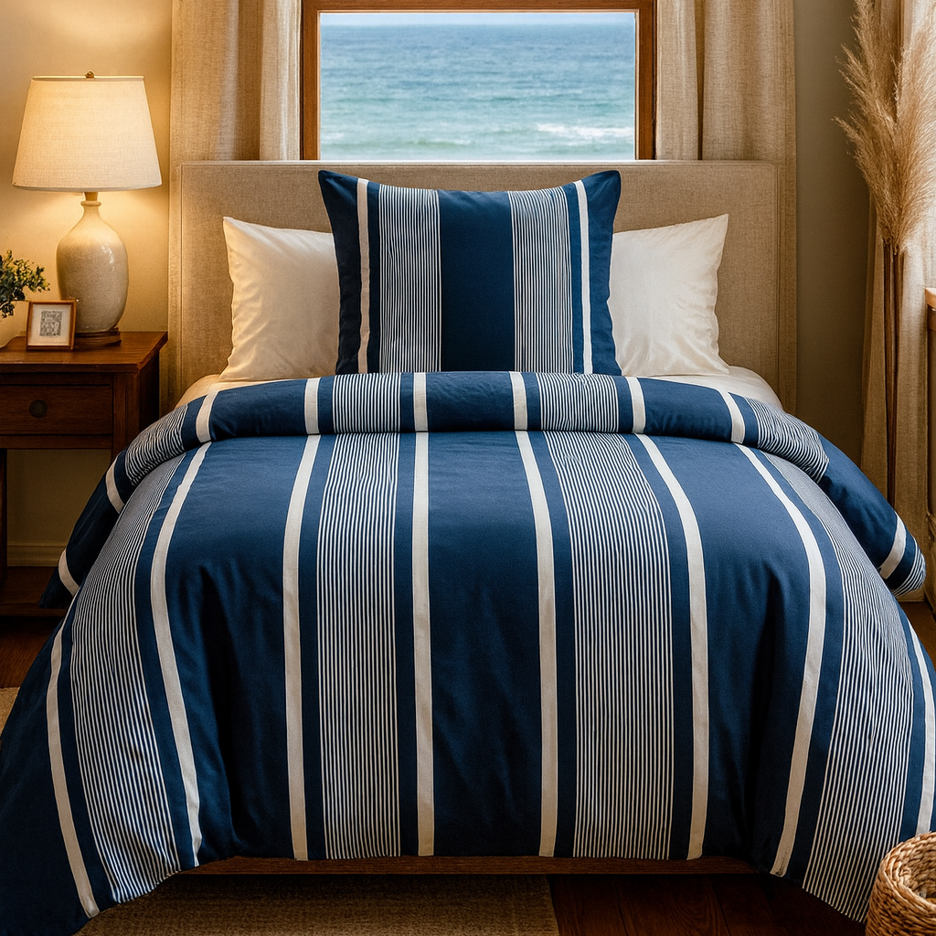 Luksus sengetøj i maritimt design – mørkeblå bomuldspercale