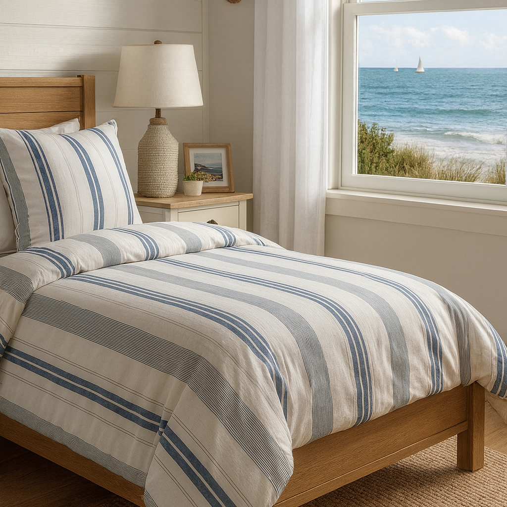Der er noget helt særligt ved klassiske blå striber. Når de møder blød, renforcévævet bomuld, får du et sengetøjssæt, der indbyder til afslapning og velvære. Med Simone i dit soveværelse får du et frisk pust af nordisk nostalgi og et tidløst look, der passer til både moderne og traditionelle hjem.