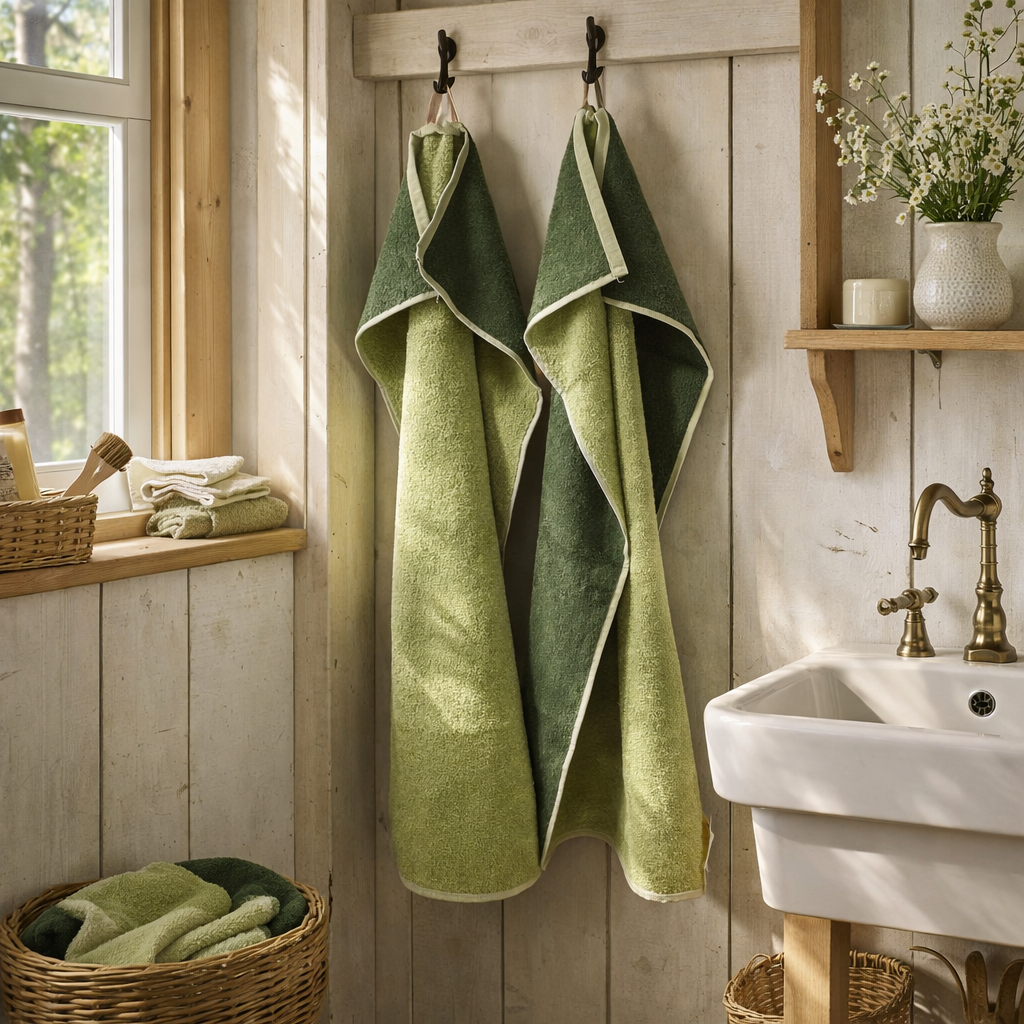 Luksus håndklæder med tosidet design i lys grøn og mørk grøn. Fås i 50x100 og 70x140 cm – bløde og eksklusive til badeværelset.