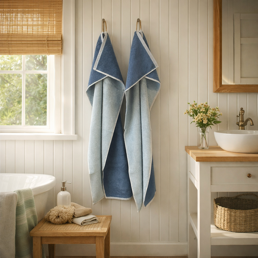 Luksus håndklæder med tosidet design i lys blå og mørk blå. Fås i 50x100 og 70x140 cm – bløde og eksklusive til badeværelset.