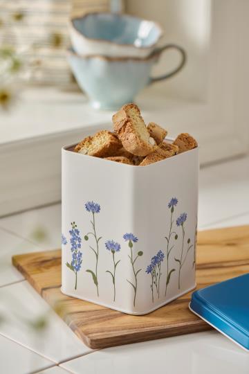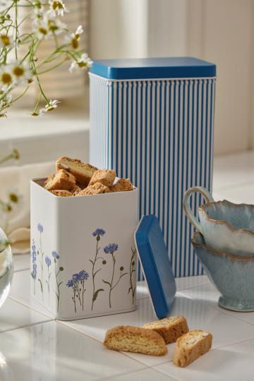Opdag denne funktionelle og dekorative dåse, prydet med kornblomster og et elegant blåt låg. Ideel til småkager eller teposer, den tilføjer et strejf af sommerstemning til ethvert hjem.