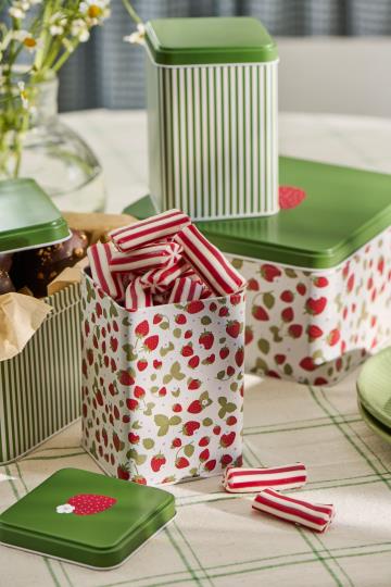 Flad dåse med et sødt jordbærdesign og et grønt låg. Dåsen er fuldfarvet offwhite indeni og perfekt til opbevaring af bagværk, slik eller andre lækkerier. En praktisk og dekorativ løsning, der bringer farve og glæde til hjemmet.