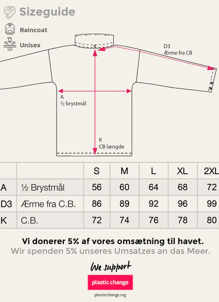 Regnjakken kan vaskes ved 40°, men vi anbefaler at undgå skyllemiddel for at bevare materialets vandtætte egenskaber.