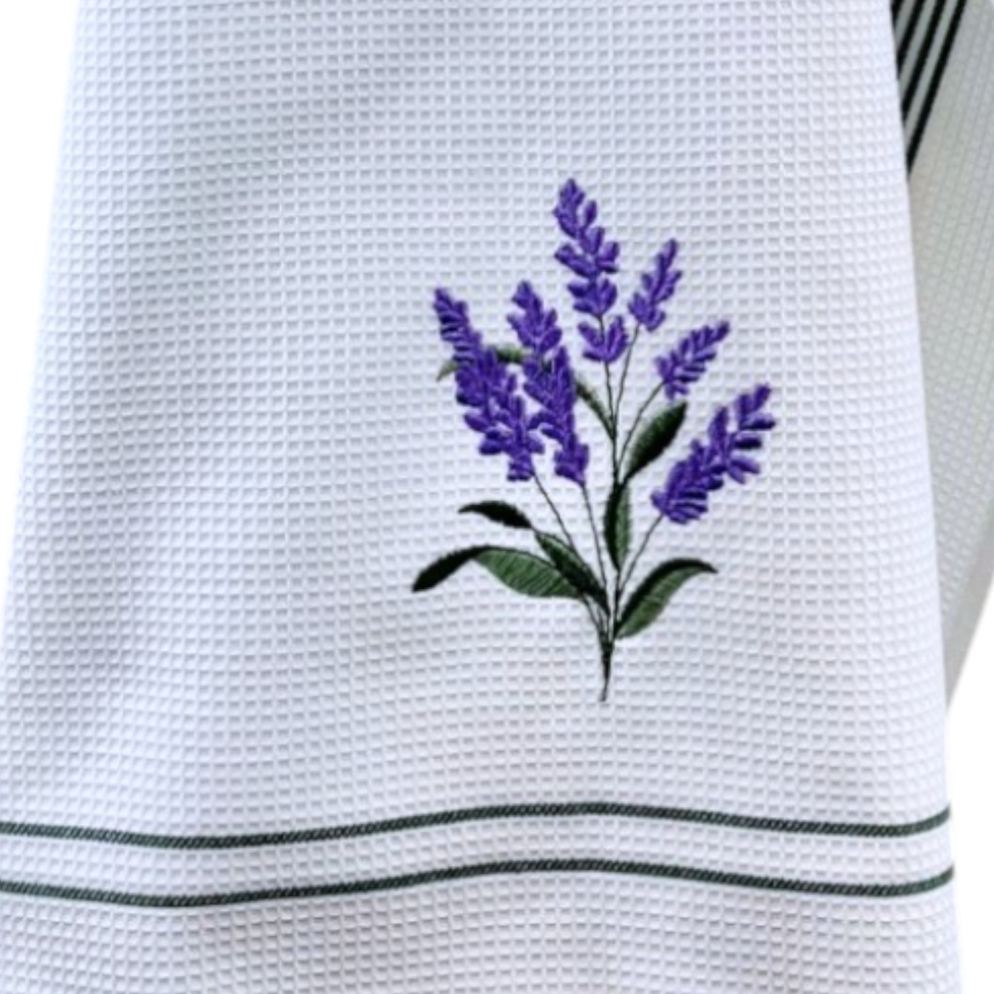 Viskestykke, Vaffelvævet, Hvid med broderi af Lavendel