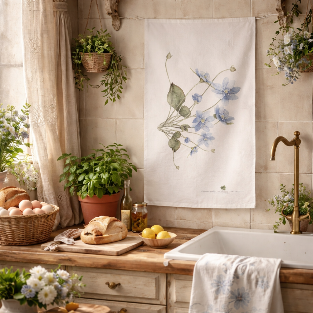 Økologisk bomuldsviskestykke med motiv af forårets yndefulde blå anemone, som er illustreret af Marianne Scheel.