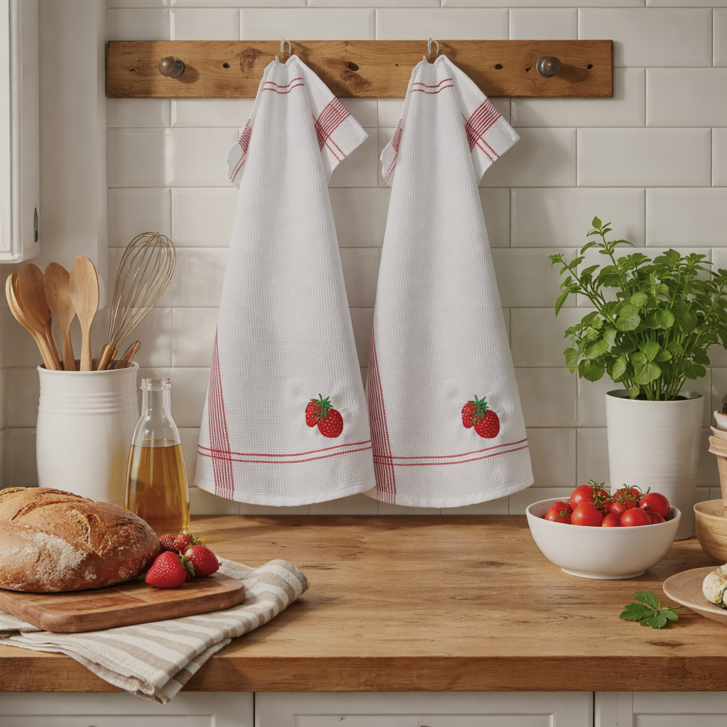 Viskestykke, Vaffelvævet, Hvid med broderi af Lavendel, 50x70cm, bomuld
