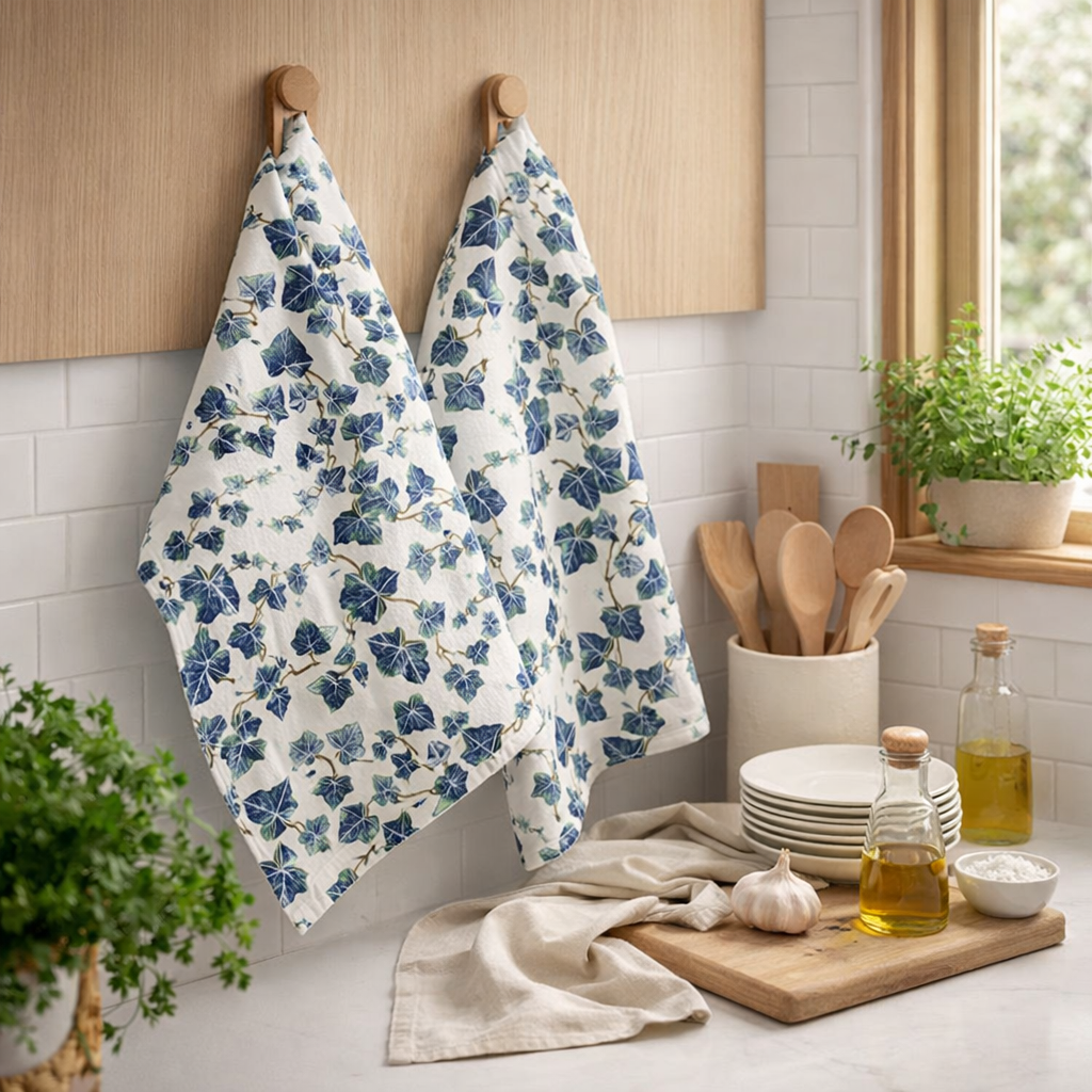 Bomuldsviskestykke af 100% økologisk bomuld med motiv af den smukke klatrende efeu. Viskestykket indgår i serien The Secret Garden, der indeholder produkter i stone washed hør, økologisk bomuld, miljøvenlige bakker og tallerkener og meget mere.