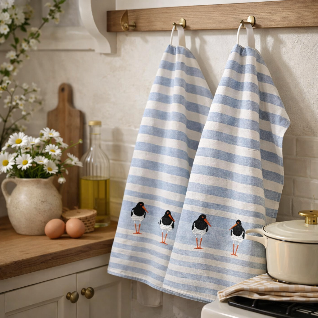 Oplev vores luksuriøse viskestykke, udført i en raffineret blanding af hør og bomuld. Det elegante broderi med strandskade fremhæver den maritime skønhed, mens den fremragende sugeevne sikrer praktisk anvendelighed. Dette kvalitetsprodukt tilføjer en sofistikeret detalje til dit køkken og gør madlavning til en æstetisk fornøjelse.Oplev dette elegante, lyseblå/hvide stribede viskestykke med maritimbroderier. Fremstillet af 55% hør og 45% bomuld, tilbyder det en overlegen absorberingsevne og er Oeko-tex 100 certificeret.