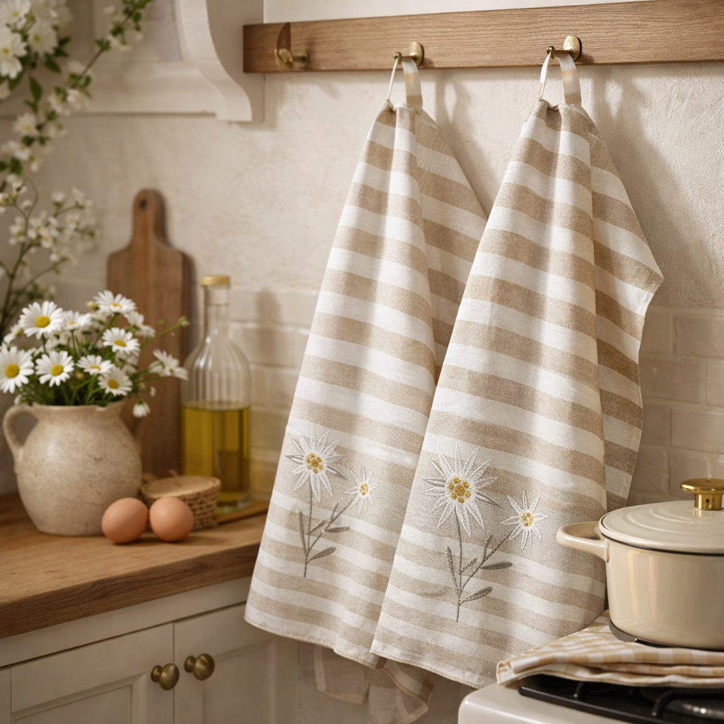 Oplev vores eksklusive viskestykke, mønstret med delikat broderi af edelweiss, der fanger essensen af Østrigs naturskønne vandreture. Ideelt til dit landkøkken, tilføjer dette viskestykke en autentisk bjergfølelse til din madlavning. Perfekt til både daglig brug og som en smuk dekoration – et must-have for naturelskere og gastronomer. Oeko-tex 100 certificeret.