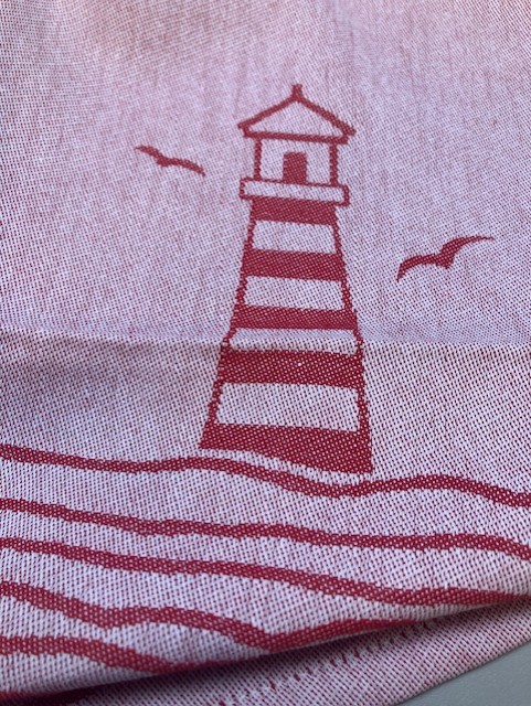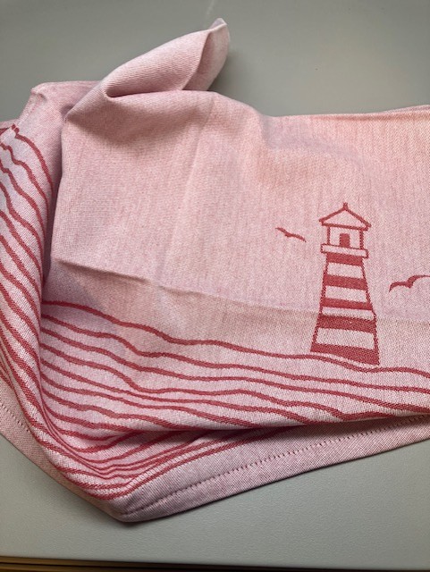Opdag vores skønne viskestykke i 100% bomuld, der måler 50x70cm. Med sit maritime design i rød og beige, prydet med et motiv af fyrtårn og bølger, bringer det en varm, nautisk stemning til dit køkken. Perfekt til både hverdag og specielle anledninger - et uundgåeligt kærligt supplement til dine køkkengrej!