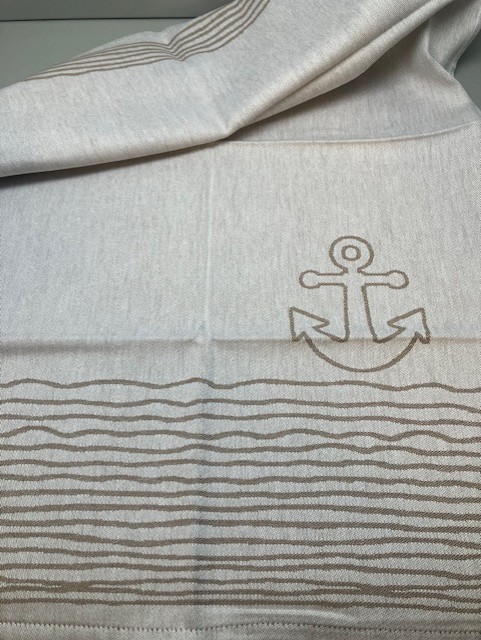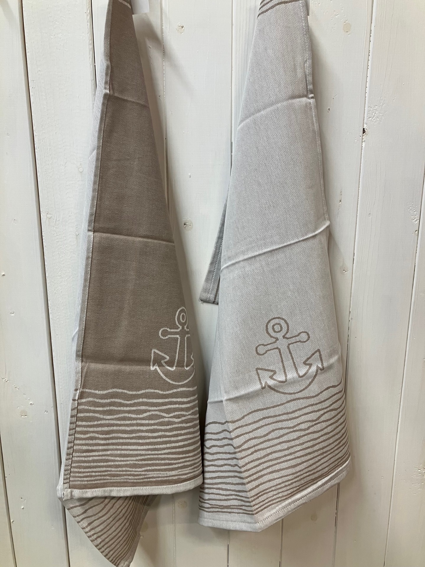 Opdag vores skønne viskestykke i 100% bomuld, der måler 50x70 cm. Det maritime design i mørk sand og beige med anker og bølger tilføjer en varm atmosfære til dit køkken. Perfekt til både hverdag og særlige lejligheder – et kærligt supplement, der giver liv og stil til dit køkkengrej!