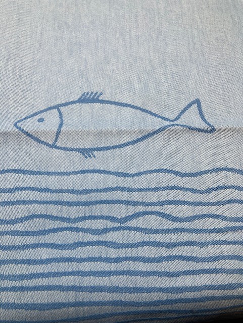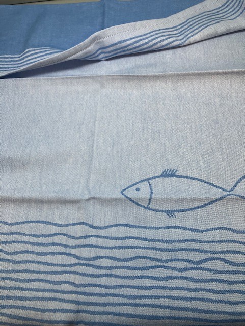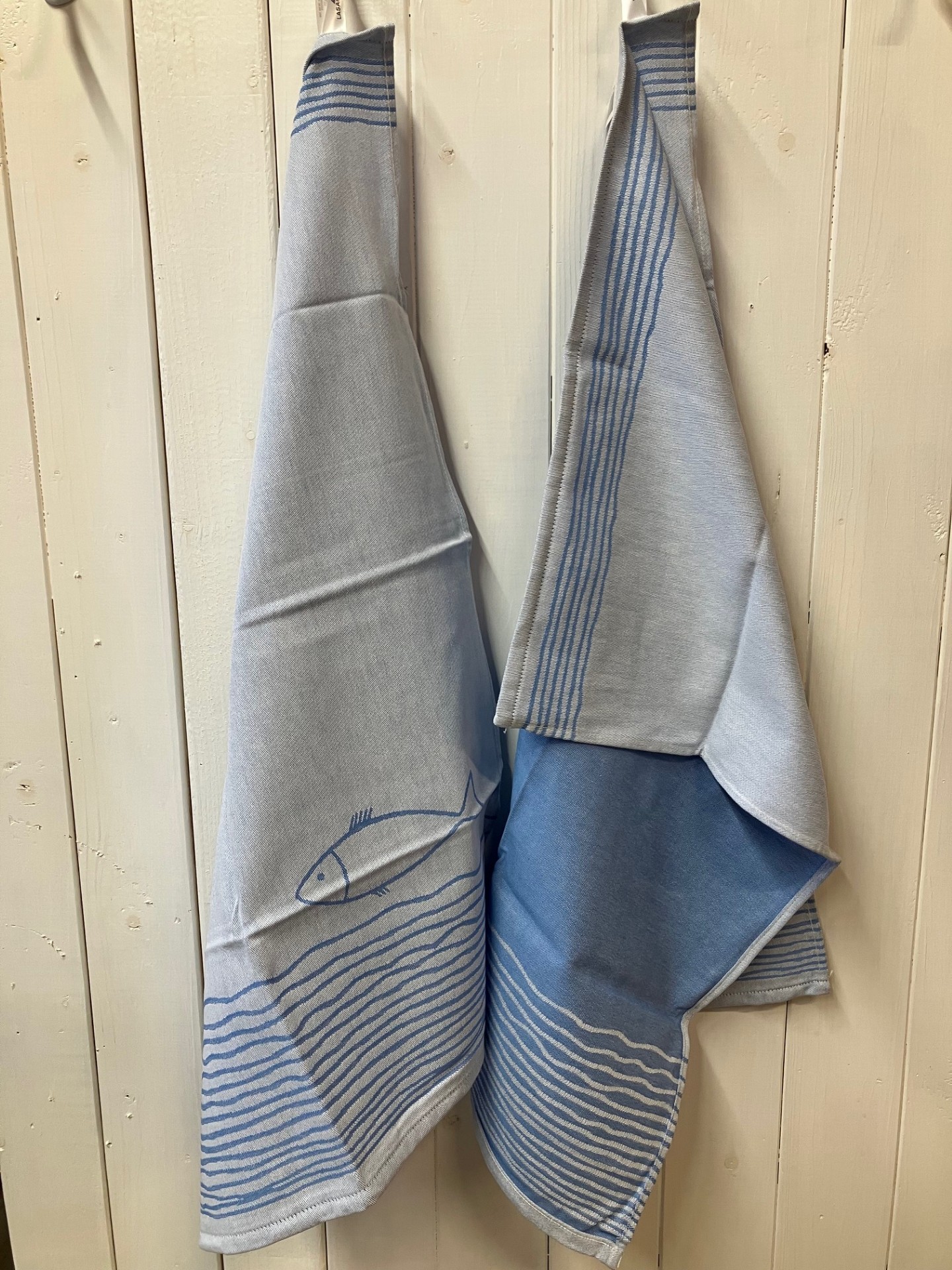 Opdag vores elegante viskestykke i 100% bomuld, målende 50x70 cm. Det maritime design med blå og beige nuancer, prydet med fisk og bølger, tilfører en varm atmosfære til dit køkken. Ideelt til både hverdag og særlige lejligheder – et uundgåeligt, stilfuldt supplement til dit køkkengrej, der leverer liv og karakter.