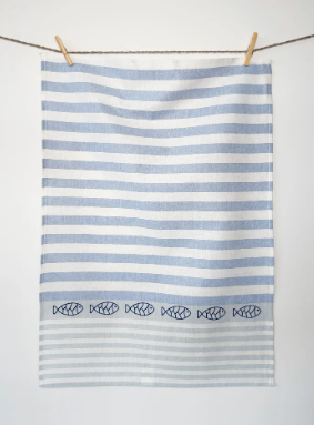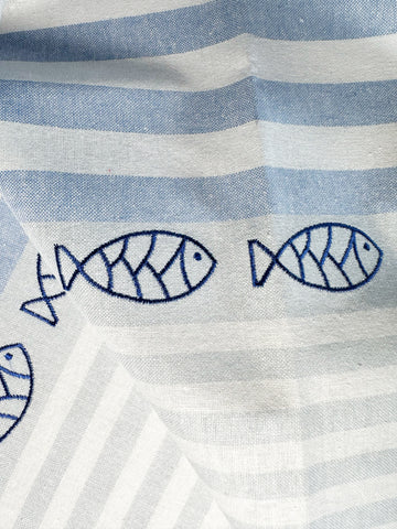 Elegant viskestykke i hør/bomuld, udsmykket med et smukt broderi af 6 fisk. Dette maritime design tilføjer et luksuriøst touch til dit køkken. Den flotte og lækre kvalitet gør det til et uundgåeligt element i din daglige rengøring. Forkæl dig selv med et produkt, der forener funktionalitet og stil på smukkeste vis. Oeko-tex 100 certificeret.