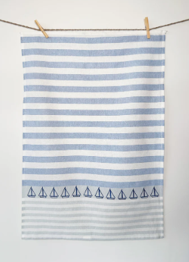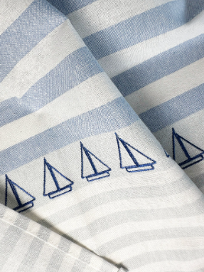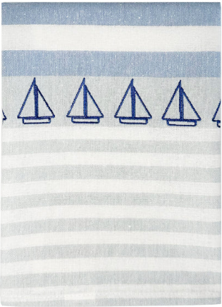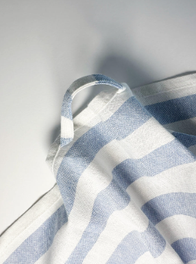 Oplev dette elegante, lyseblå/hvide stribede viskestykke med maritimbroderier. Fremstillet af 55% hør og 45% bomuld, tilbyder det en overlegen absorberingsevne og er Oeko-tex 100 certificeret.
