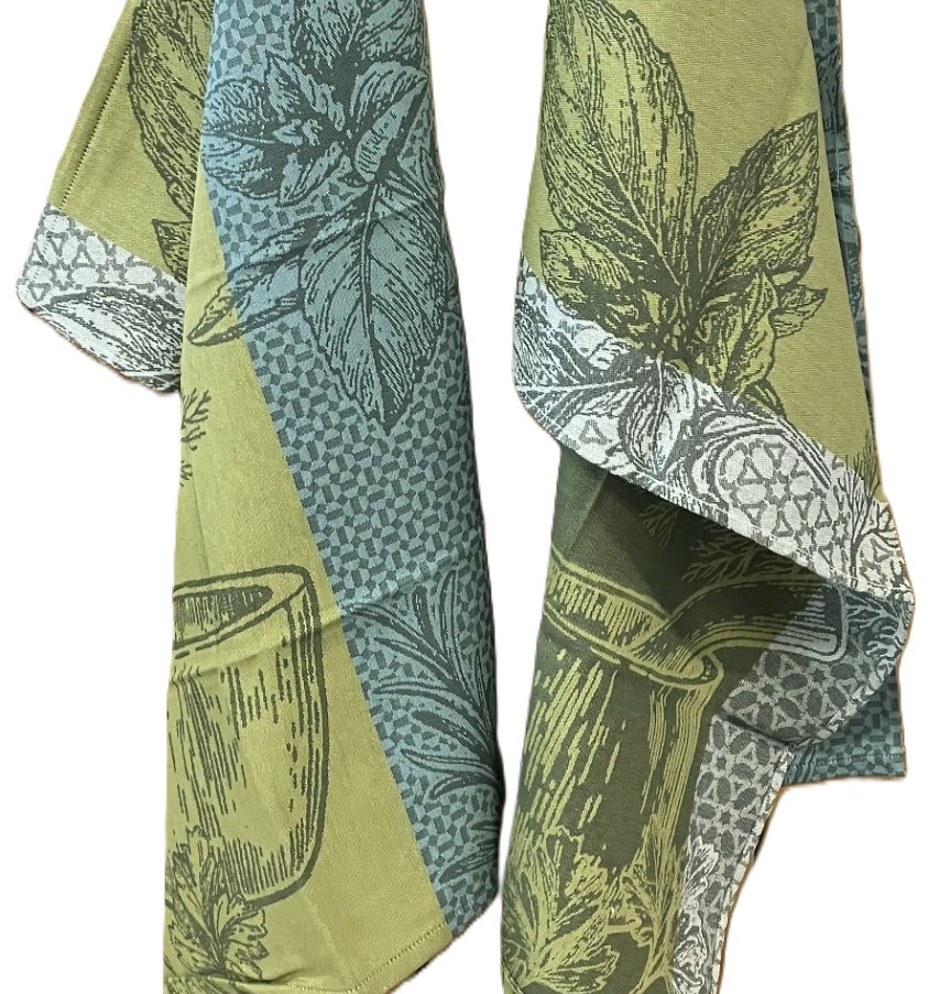 Opdag vores elegante viskestykke med aroma i grønne nuancer, prydet med motiver af livlige krydderurter og en charmerende morter med støder. Perfekt til kulinariske eventyr! Viskestykke i 100% bomuld.